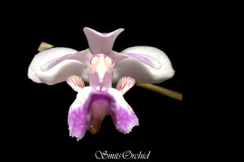 Labellum 28 mm long, 3 lobed, very shortly clawed, somewhat geniculately inflexed at the claw; lateral lobes yellowish with purple coloured strips; 5 X 3-4 mm, oblong, obtuse, entire or slightly crenulate, more or less spreading, but erect at the base, with a somewhat square hollow which leads to the spur ; the entrance to the spur being somewhat arched over by 2 fleshy, pinkish white subconical calli, lying back to back with their apices diverging; midlobe 22 X 20 mm, pink-mauve, deeper than the sepals and petals, broadly ovate, 5-7 mm broad at the apex, retuse ; margins deflexed, finely crisped, crenulate.