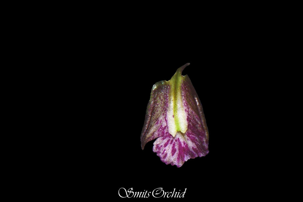 Labellum 4 x 5-5.5 mm, fused for about 1-2 mm to the apex of the foot, curved, clawed 3-lobed ; claw narrow, 2 mm long, pale mauve; lateral lobes 5 x 1 mm, erect, more or less parallel with the column, linear, acute, entire, pale purplish green with many purple nerves on the inside; midlobe 2x4 mm, white flushed with pink-purple with a few deeper-coloured nerves, transversely oblong orbicular, truncate or slightly retuse at the apex, margins irregularly denticulate ; disc narrow, pale green, with 3 green parallel nerves, teminated by a slightly widened, free, 2-lobed callus.