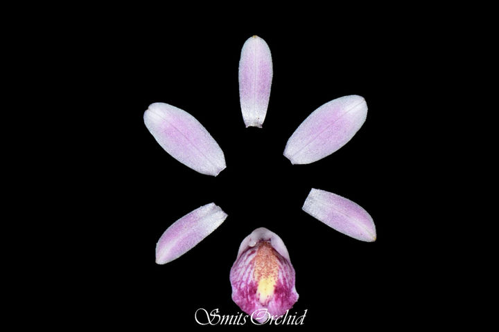 Lip attached all along to the foot, forming a 5 mm deep, concave, rounded trough, flattening out a little at the apex; in colour white flushed with pale pink or mauve on the out side as sepals and petals, the inside with deep purple veins on the sides, a central yellow disc bordered with deep mauve and with 2 thin purple veins in the centre of the disc. The lip 12 mm long, 10 mm broad on flattening, deltoid-oblong in outline, obscurely 3-lobed ; lateral lobes broad, subentire, middle one crenulate, emarginate.