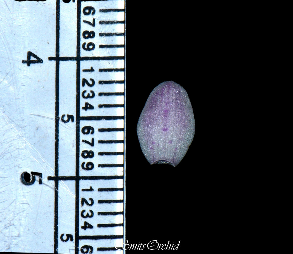Sepals Pale pink spotted with deeper coloured spots, dorsal sepal 7 x5 mm ovate-oblong, obtuse, entire, glabrous, faintly many-nerved; lateral sepals 8 x7 mm obliquely and broadly oblong, somewhat decumbent on the column-foot, acute.